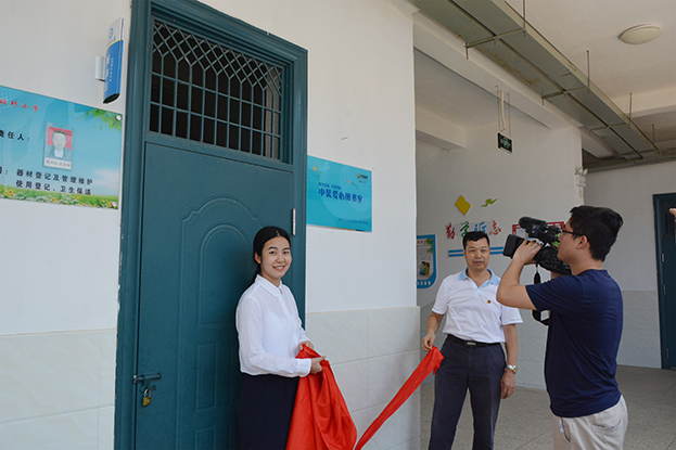▲桂园街道领导与BTY必一体育(B体育)官方网站_BTY必一体育官方网站代表为“中装爱心图书室”揭牌